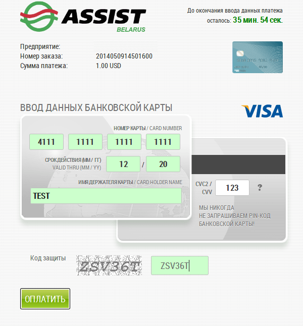 При выборе оплаты заказа с помощью банковской карты, обработка платежа (включая ввод номера банковской карты) производится ООО «Компанией электронных платежей «АССИСТ» с использованием программно-аппаратного комплекса системы электронных платежей Assist Belarus, которая прошла международную сертификацию.